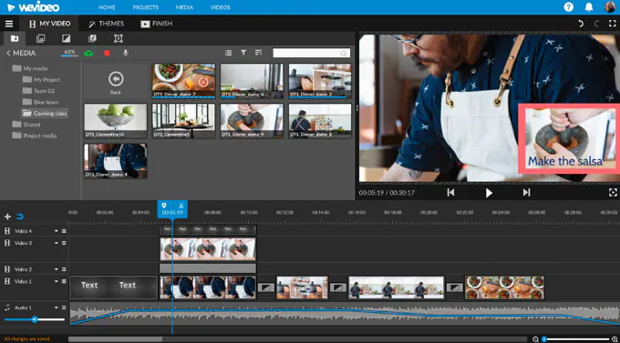 Następnym programem, który jest oparty na chmurze, jest WeVideo. To doskonały wybór do edycji materiałów filmowych 4K z drona. Umożliwia uzyskanie do niego dostępu z dowolnego urządzenia, mającego połączenie internetowe. Dodatkowo jego zaletą jest to, że obsługuje większość formatów mediów. Znajdziesz w nim oczywiście wszystkie podstawowe narzędzia do edycji wideo, które pozwalają m.in. na przycinanie i wycinanie klipu, dodawanie efektów specjalnych, przejść, filtrów, a także muzyki. Natomiast zaawansowane funkcje to np. WeVideo JumpStart, nagrywanie ekranu, Cloud storage, efekt Green Screen i wiele innych!