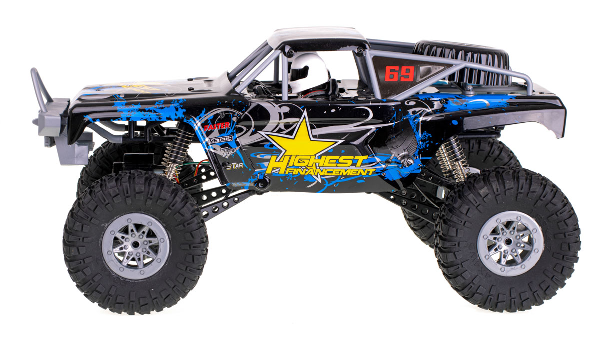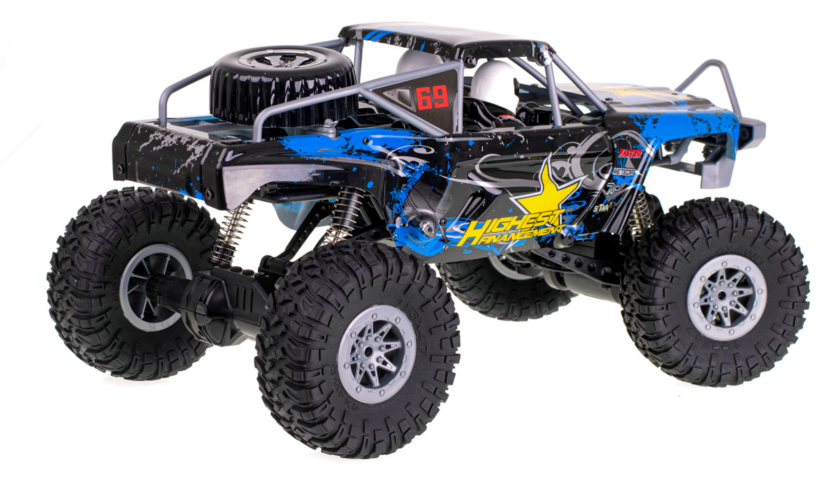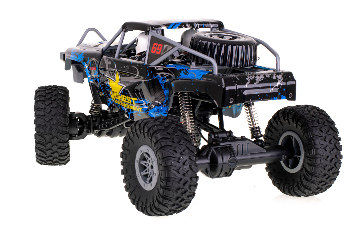 Solidny i efektowny samochód terenowy z napędem na cztery koła, który bez problemu pokonuje nierówności, przeszkody i trudny teren. Każda oś ma osobny silnik, a duże gumowe opony zapewniają przyczepność na różnych nawierzchniach.